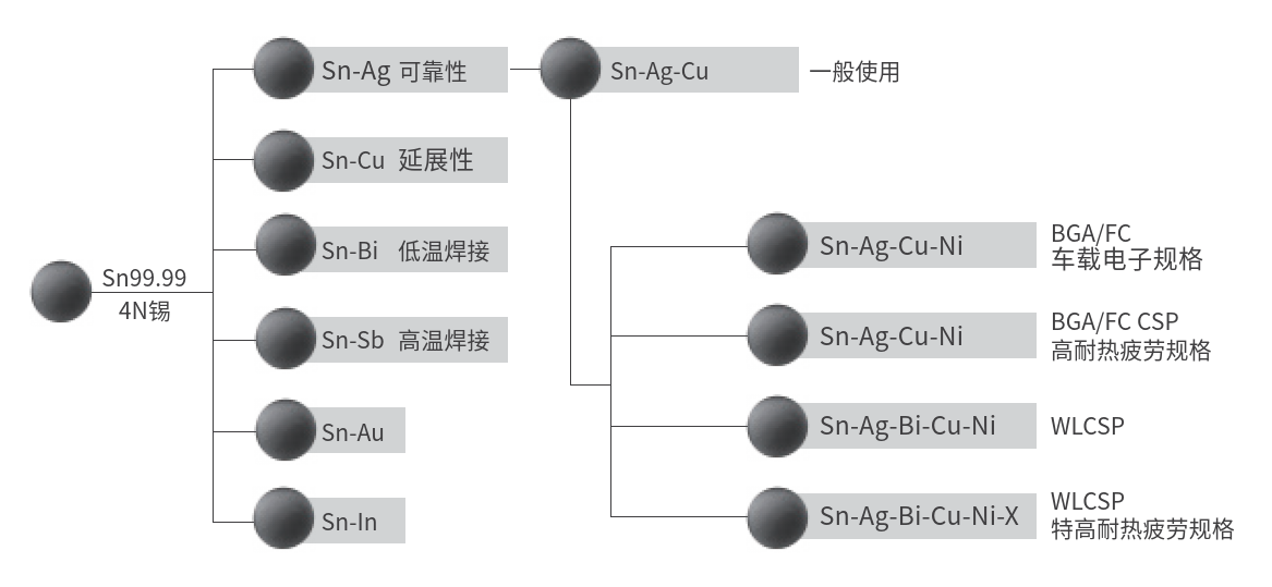 同方 BGA 焊錫球產(chǎn)品球徑可涵蓋 0.05mm至 1.30mm,同時(shí),在傳統(tǒng)錫、銀、銅三元合金基礎(chǔ)上,開(kāi)發(fā)出多元合金,為客戶(hù)提供定制化的服 務(wù)。針對(duì)不同熔點(diǎn),不同應(yīng)用領(lǐng)域,我們還開(kāi)發(fā)出一系列適用于不同應(yīng)用溫度和焊接要求的焊錫球產(chǎn)品,如低溫焊錫球 (95-135°C)、高溫焊球(186-309°℃),耐疲 勞高純度焊錫球、Ultra low α 焊錫球等等。
